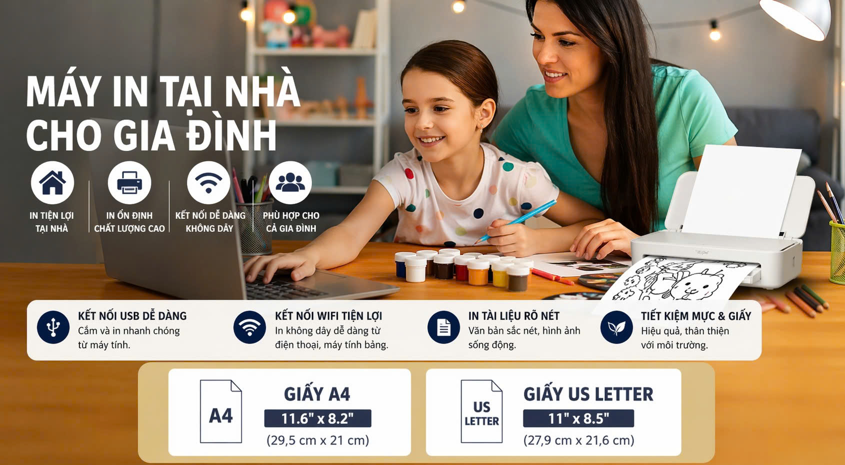 Khi kết hợp với giấy bóng cao cấp HPRT (khổ US Letter 8.5" x 11"), máy cho ra những bản in rõ nét, màu sắc đậm và hiệu ứng mượt mà. Điều này giúp nâng cao chất lượng tài liệu, hình ảnh, đáp ứng tốt cả nhu cầu học tập lẫn công việc.