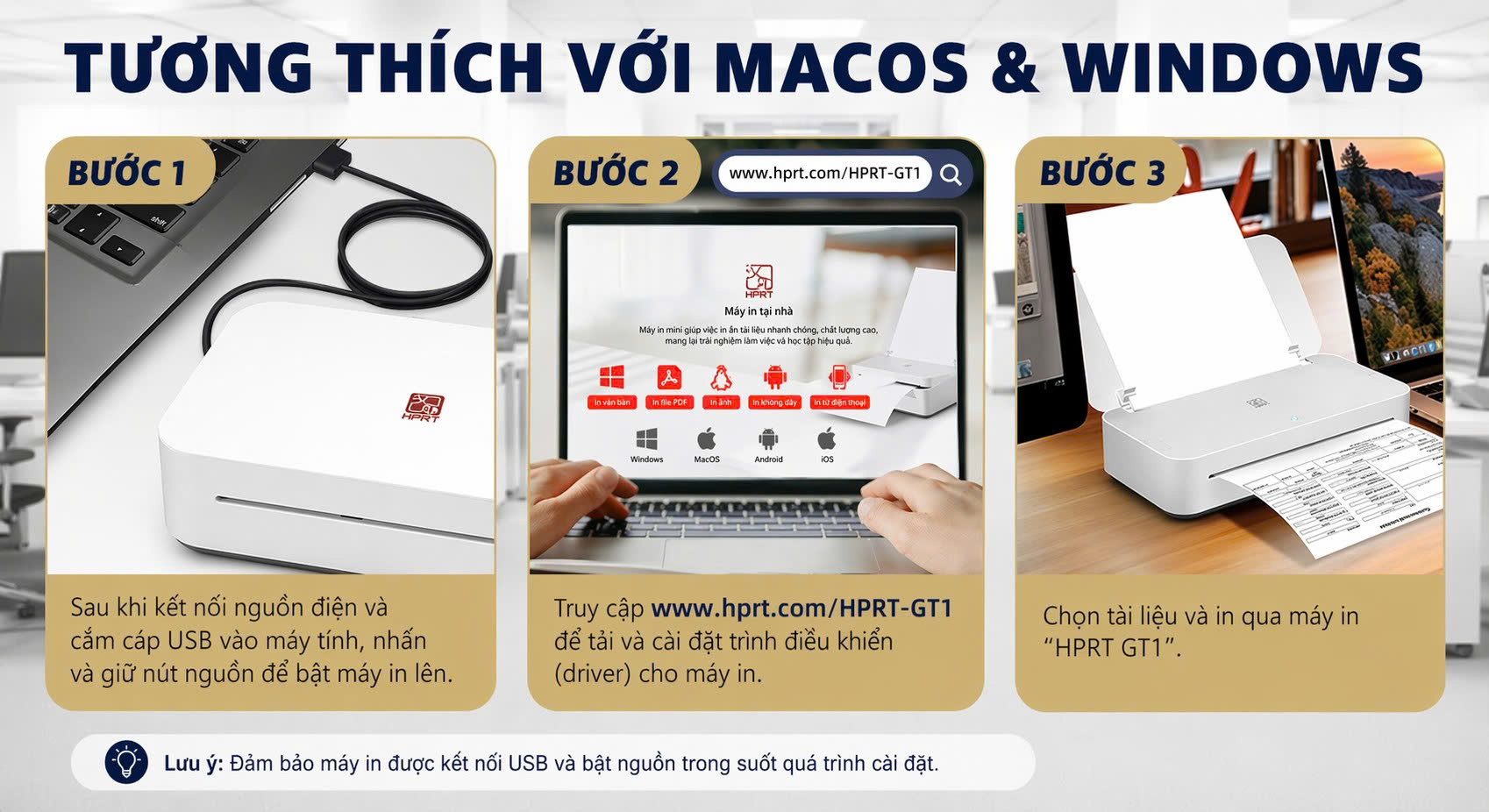 Máy in HPRT GT1 được thiết kế để hoạt động mượt mà trên cả hai hệ điều hành phổ biến là macOS và Windows, giúp người dùng dễ dàng sử dụng trên nhiều thiết bị khác nhau. Chỉ cần tải driver tương ứng từ trang chính thức, bạn có thể nhanh chóng cài đặt và bắt đầu in ấn trên máy tính của mình.