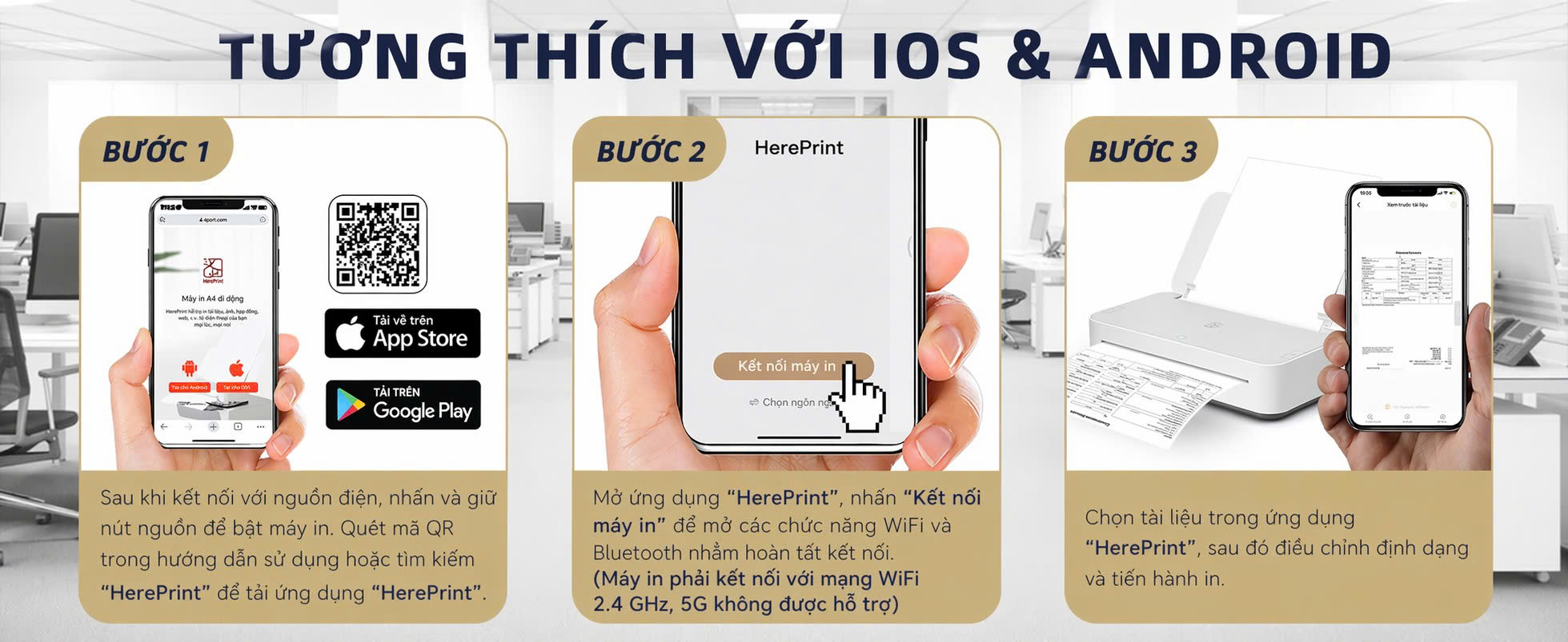 Với khả năng kết nối Wifi cùng ứng dụng chuyên dụng, HPRT GT1 cho phép bạn in ấn trực tiếp từ điện thoại hoặc máy tính bảng một cách nhanh chóng. Chỉ cần thiết lập một lần duy nhất, mọi thao tác in về sau sẽ được thực hiện tự động, giúp tối ưu trải nghiệm người dùng.