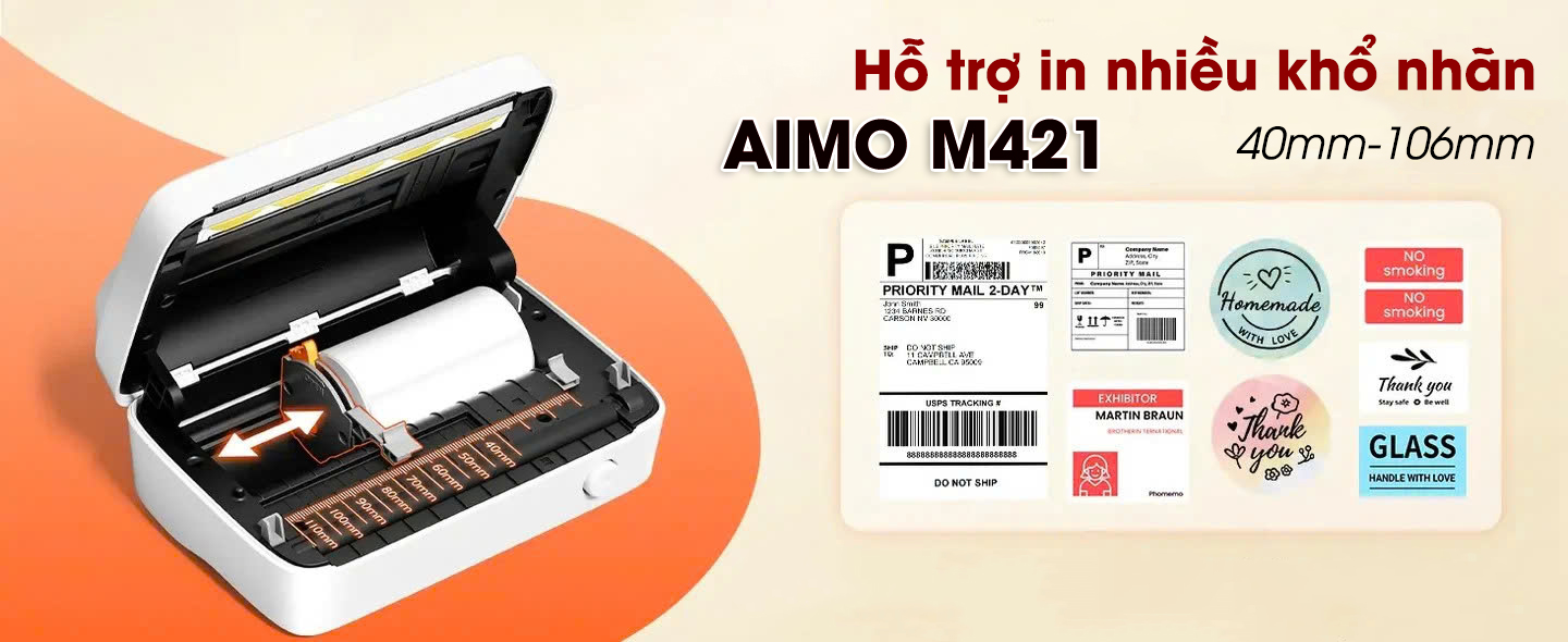 🔹 AIMO M421 có thể in nhãn từ 40mm đến 106mm, phù hợp với nhiều loại sản phẩm:
