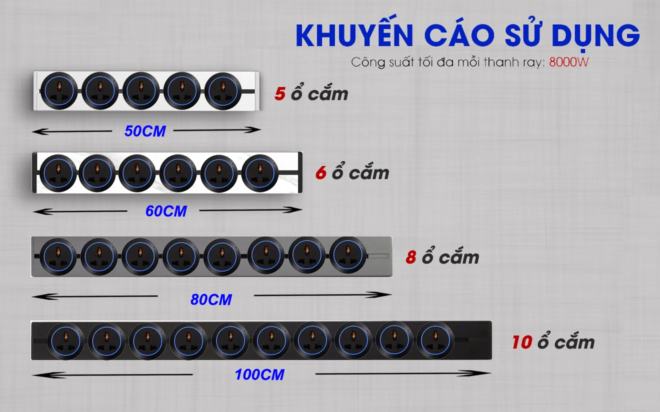 - Thanh ray 80cm: tối đa 8 ổ cắm