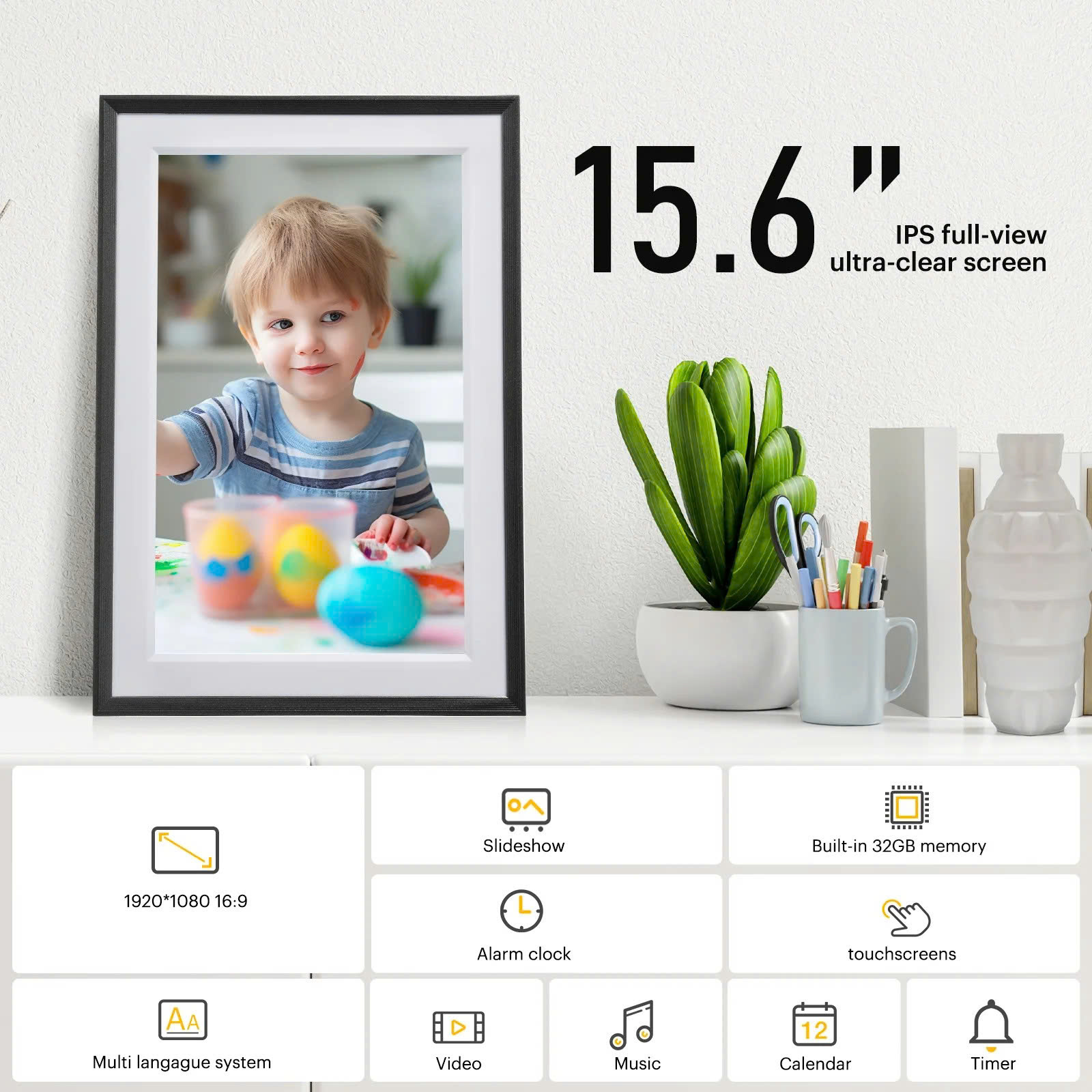 Màn hình cảm ứng HD 𝟏𝟓.𝟔 inch: Khung ảnh kỹ thuật số này được trang bị màn hình cảm ứng IPS độ phân giải cao 1920x1080, màu sắc phong phú và rực rỡ có thể hiển thị ảnh của bạn với chất lượng hình ảnh vượt trội. Màn hình cảm ứng này rất dễ thao tác, chỉ cần nhấc ngón tay lên và sau đó bạn có thể xem những khoảnh khắc đáng nhớ nhất với gia đình và bạn bè ở độ phân giải HD chất lượng cao.
